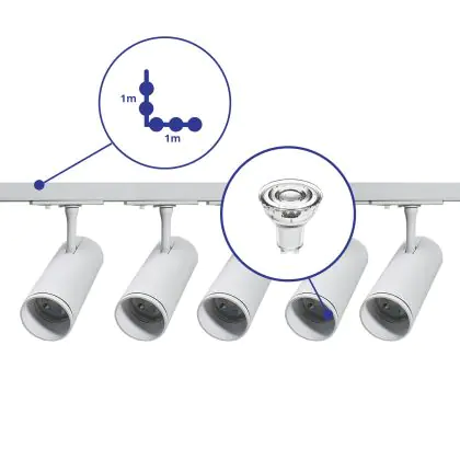 Complete Set 1-Fase Rail L 1 x 1 Meter Wit | incl. 5x Spot + GU10 2700K 3W Dimbaar + 1 x 1 Meter Eindkap, Voedingsconnector en L -Verbindingsstuk