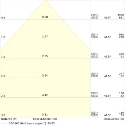 De gradenbundel geeft informatie over hoe breed het licht wordt uitgestraald. Dit zit tussen de 0 en 360 graden (D). Hoe kleiner de hoek, hoe specifieker de lichtbundel is. Over het algemeen is een smalle gradenbundel perfect voor sfeer- of accentverlichting, terwijl een brede gradenbundel ideaal is om grote oppervlaktes te verlichten.